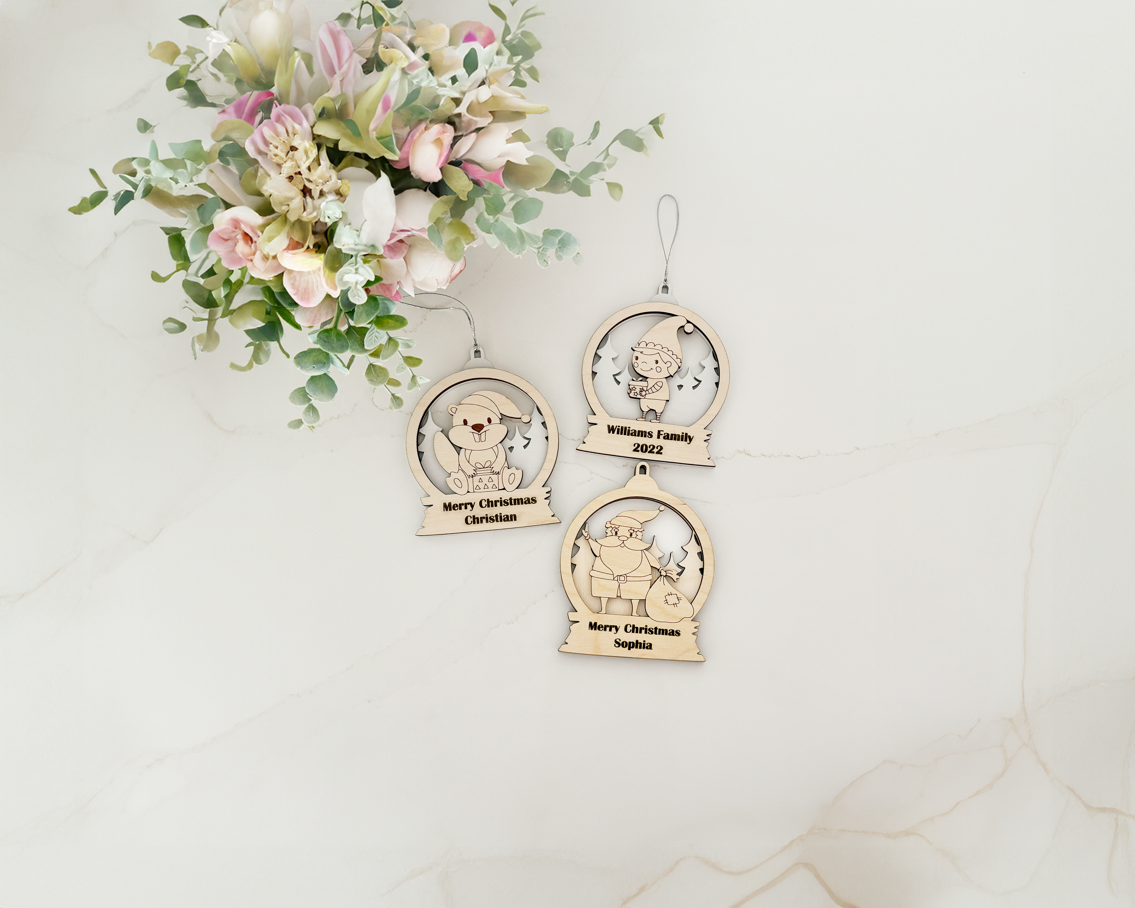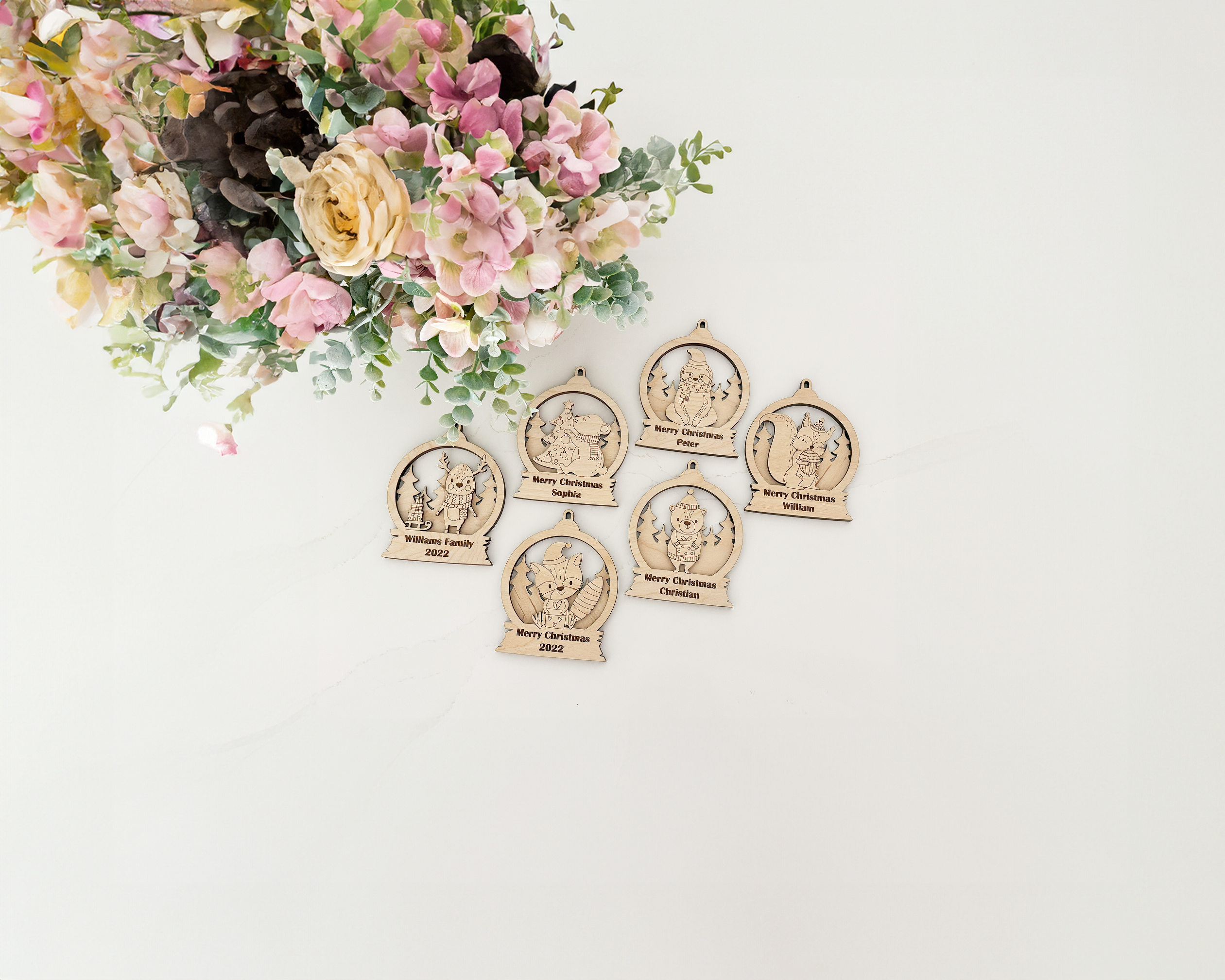 Featuring festive figurines like Santa Claus, reindeer, and various wild animals, each piece adds a charming touch of holiday spirit to your ornament.