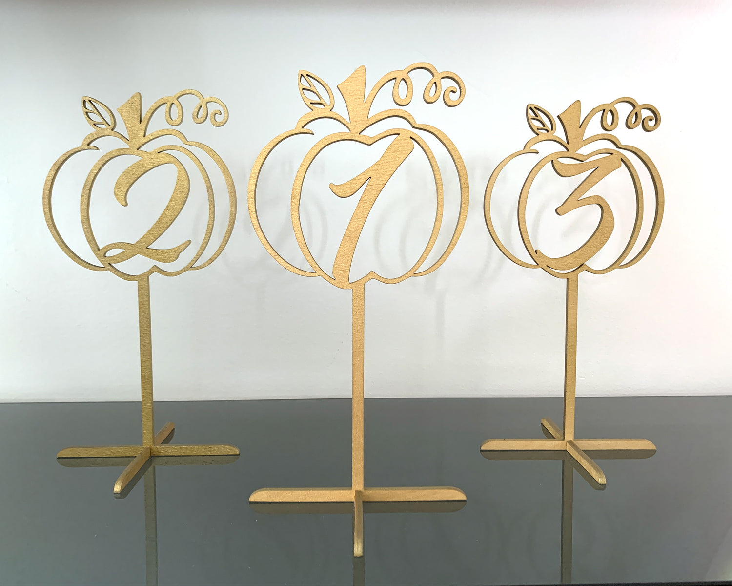 Jacey approached us with a request for custom wedding table numbers infused with Halloween spooky elements to match her unique wedding theme. After discussing various ideas, we decided to incorporate pumpkins, a well-known symbol of Halloween, into the design. The result was a set of beautifully crafted table numbers featuring elegant pumpkin motifs, perfectly blending the spooky charm of Halloween with the romantic ambiance of her wedding day.